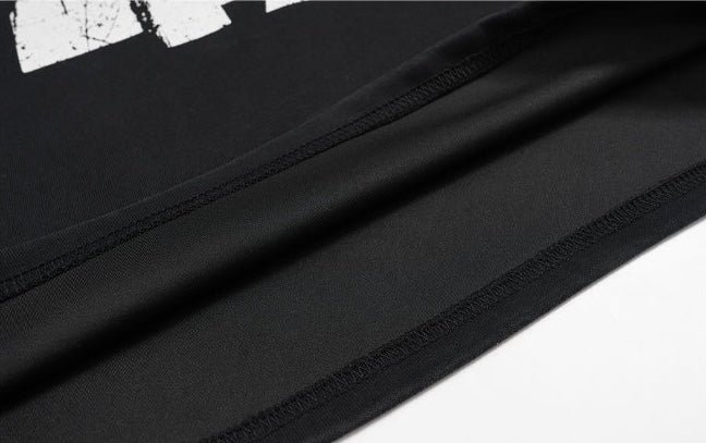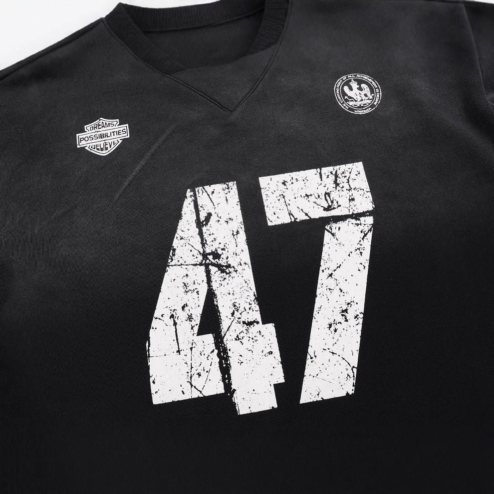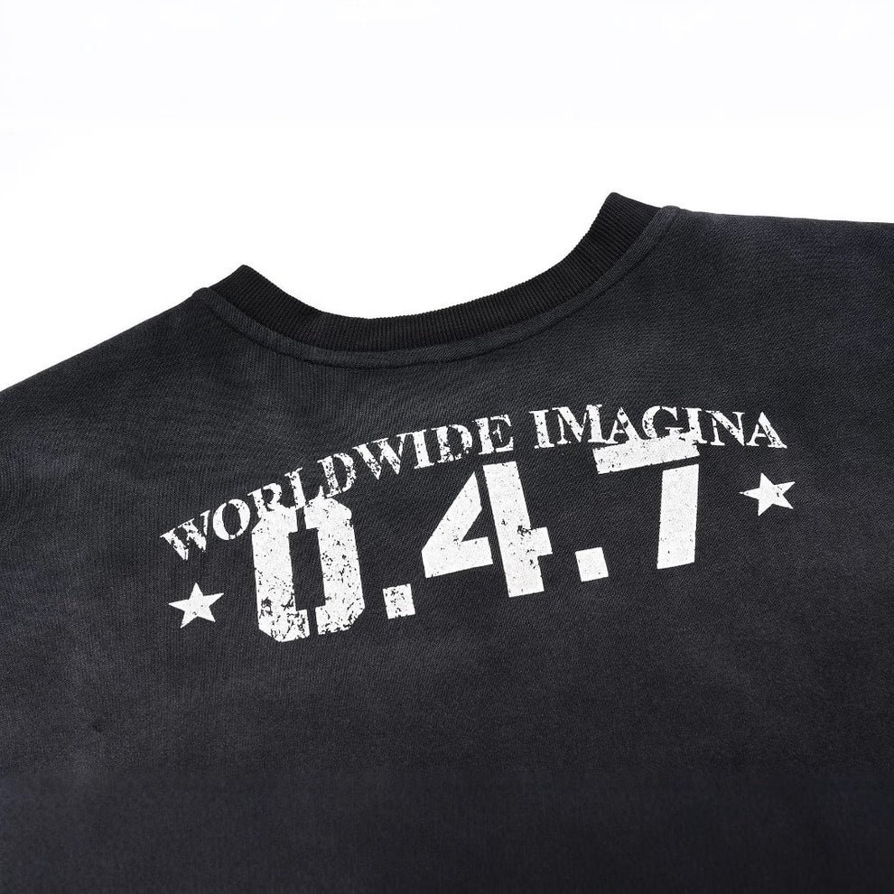 Le stampe leggermente consumate e i dettagli tipografici sulle maniche rafforzano l’identità streetwear del prodotto.