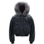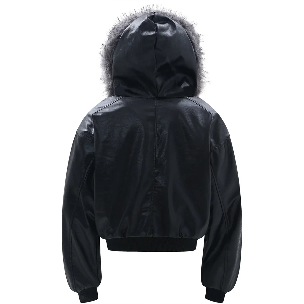 Il design frontale è arricchito da cuciture sagomate che donano movimento e profondità al capo, mentre la chiusura con zip in metallo centrale aggiunge un tocco deciso e funzionale. Il cappuccio è impreziosito da un bordo in eco-pelliccia voluminosa che crea contrasto e rafforza l’estetica luxury street.