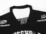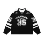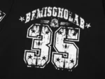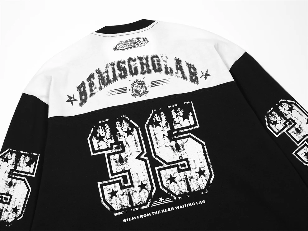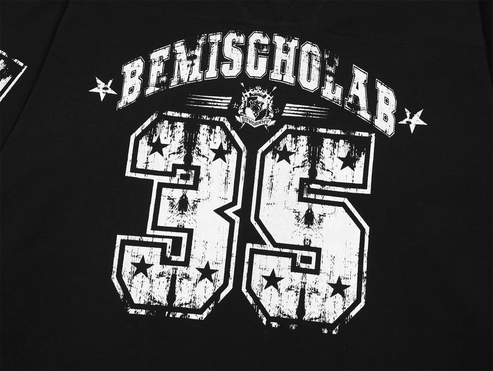 Il design bicolor nero e bianco richiama le classiche jersey sportive americane, con dettagli grafici d’impatto. Sul fronte domina la scritta “REMISCHOLAB” accompagnata dal numero 35 effetto distressed con texture vintage e stelle a contrasto. Le maniche presentano numerazioni coordinate e bande orizzontali in stile college, mentre sul retro il maxi 35rafforza l’estetica bold del capo.