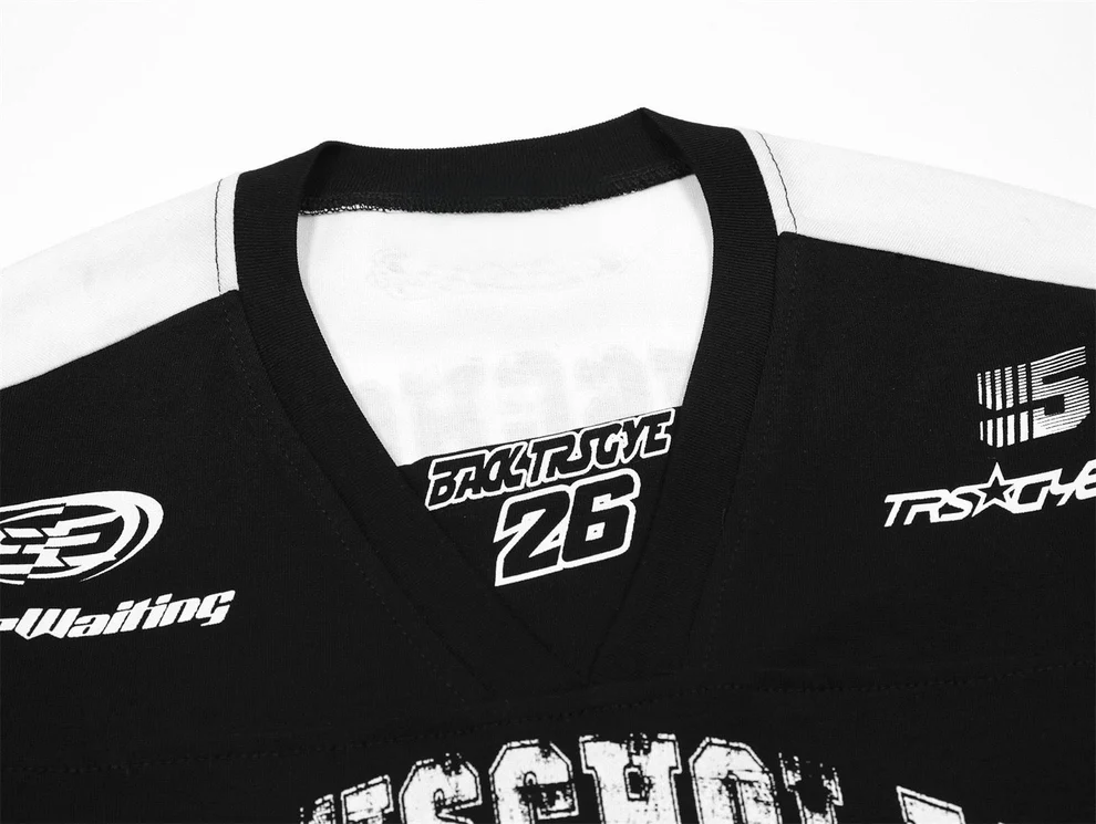 Il colletto a V rinforzato dona carattere e richiama l’ispirazione sportswear, mantenendo però la comodità e la morbidezza tipica del cotone di alta qualità. Le stampe sono realizzate con finitura leggermente consumata per un effetto lived-in che aggiunge personalità.